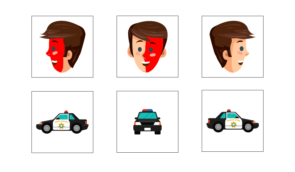 Imagem 1 - Ao serem apresentadas faces e objetos em diversas perspetivas, apenas as faces onde o lado direito estava visível apresentaram deformações.