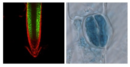 Expressão do gene ZIFL1 na raiz (fluorescência verde, à esquerda) e nos estomas da folha (corante azul, à direita) em Arabidopsis thaliana. Créditos: Estelle Remy, IGC.
