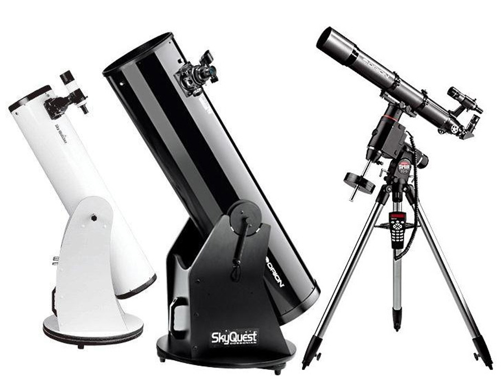 - FOTO - Exemplos de telescópios de amador: Telescópios reflectores de Newton em montagem de Dobson (ao centro e à esquerda); telescópio refractor, em montagem equatorial (à direita). (JPEG 168 KB)