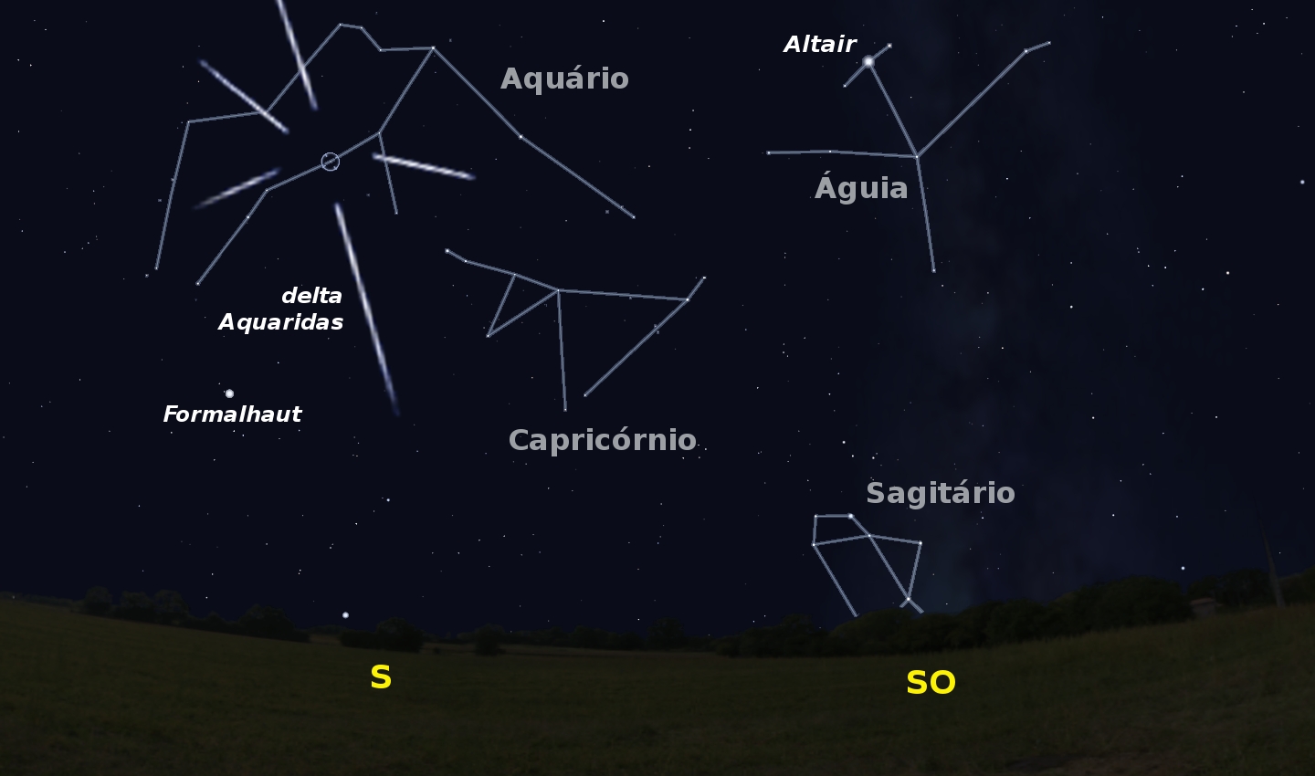 A Lua Nova tem lugar na noite de dia 26, e duas noites depois dar-se-á o pico de atividade da chuva de meteoros das delta Aquáridas. De notar que a vintena de meteoros por hora que se espera no máximo para locais realmente escuros, ficará muito aquém das chuvas de estrelas mais intensas deste ano.