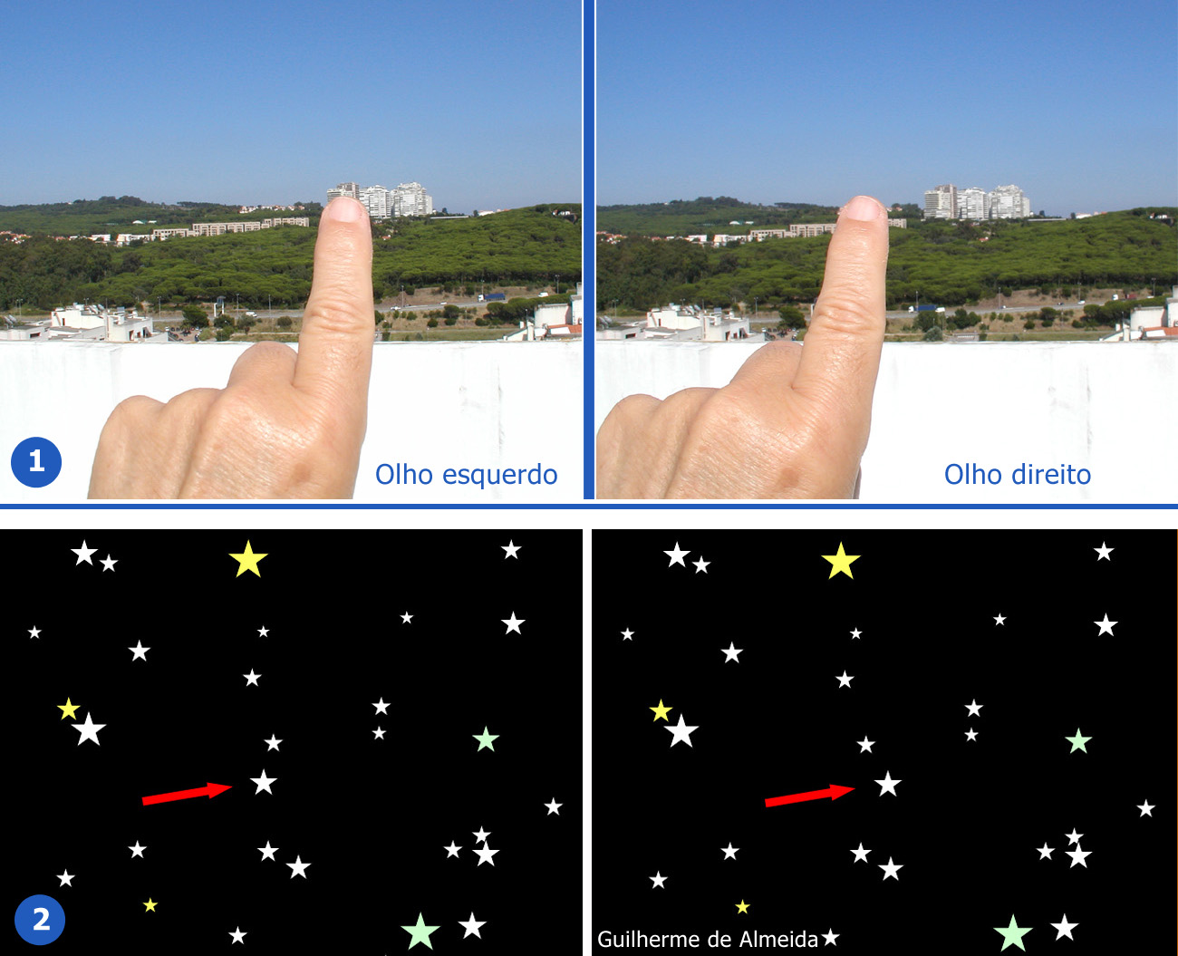 Faça o Leitor esta experiência curiosa: olhe para uma paisagem afastada. Estenda o seu braço (o esquerdo ou o direito) e aponte o dedo indicador para cima. Sem mover a sua cabeça, olhe alternadamente pelo olho esquerdo e pelo olho direito. Vai reparar que a direcção de um ponto da paisagem, por exemplo uma árvore ou uma janela, alinhada com o seu dedo ao olhar pelo olho esquerdo, vai passar a ser vista mais à direita do dedo quando olha pelo olho direito. Se repetir a experiência com o dedo mais perto da sua cara, o efeito será ainda maior.