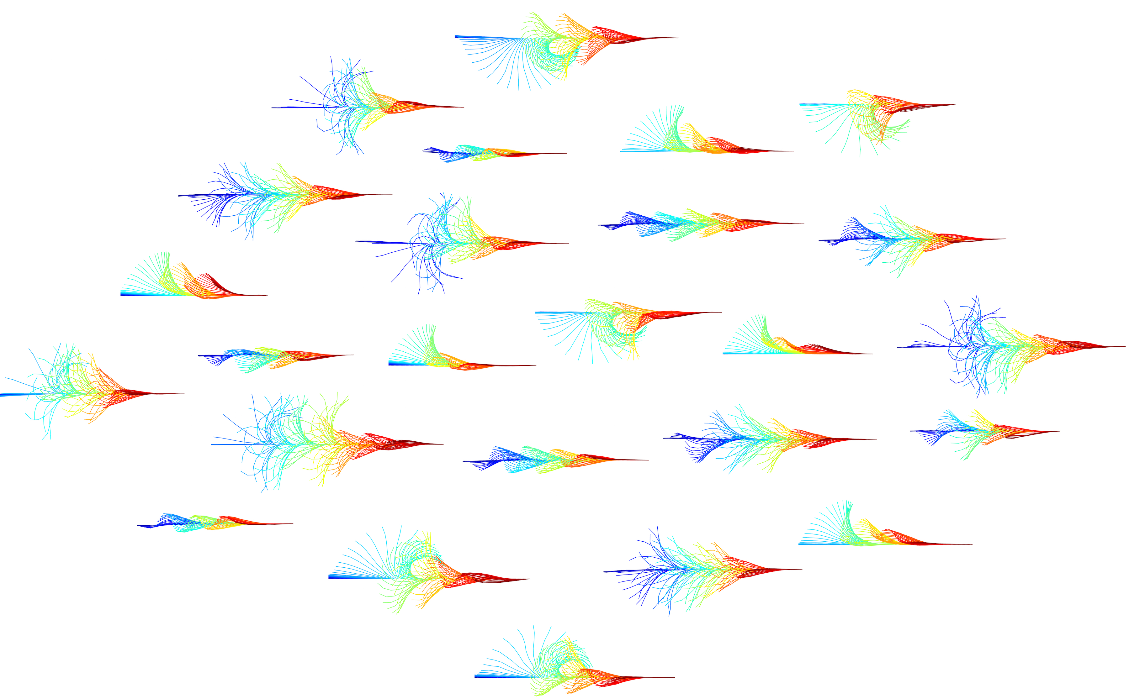 Legenda da ilustração anexa: Exemplos de movimentos de larvas de peixe-zebra, representados pela posição da cauda ao longo do tempo. As cores marcam a passagem do tempo (azul no início do movimento e vermelho no fim). Crédito: João Marques