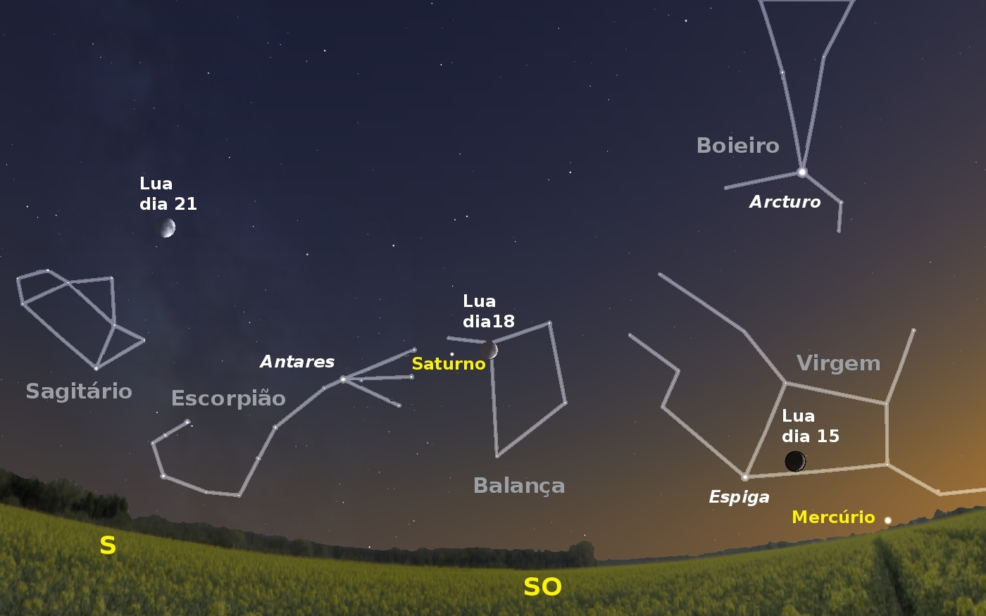 No espaço de uma semana podemos apreciar facilmente o movimento da Lua no céu: no dia 15 a Lua situar-se-á a poucos graus de Mercúrio e de Espiga, a estrela mais brilhante da constelação da Virgem; na noite de dia 18 a Lua situar-se-á perto de Saturno, que por esta altura se situa ao pé da constelação da Balança; e, para finalizar, aquando do quarto crescente de dia 21 o nosso satélite natural já estará junto à constelação do Sagitário.